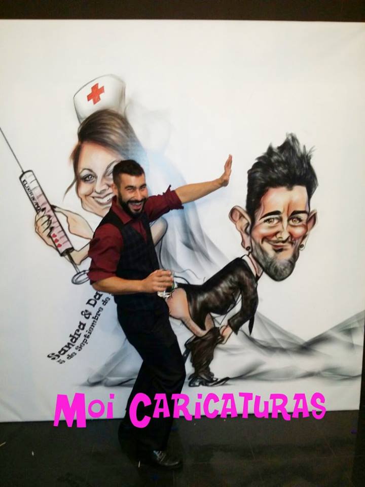 Podeis encargar divertidas caricaturas para haceros un fotocall donde vuestros invitados se fotografiarán en la boda. Desde una caricatura simpática a escenas más atrevidas o con fondos que puden representar momentos especiales de vuestra vida. Los dibujos se harían en formato digital para que vuestra imprenta os haga el fotocall.