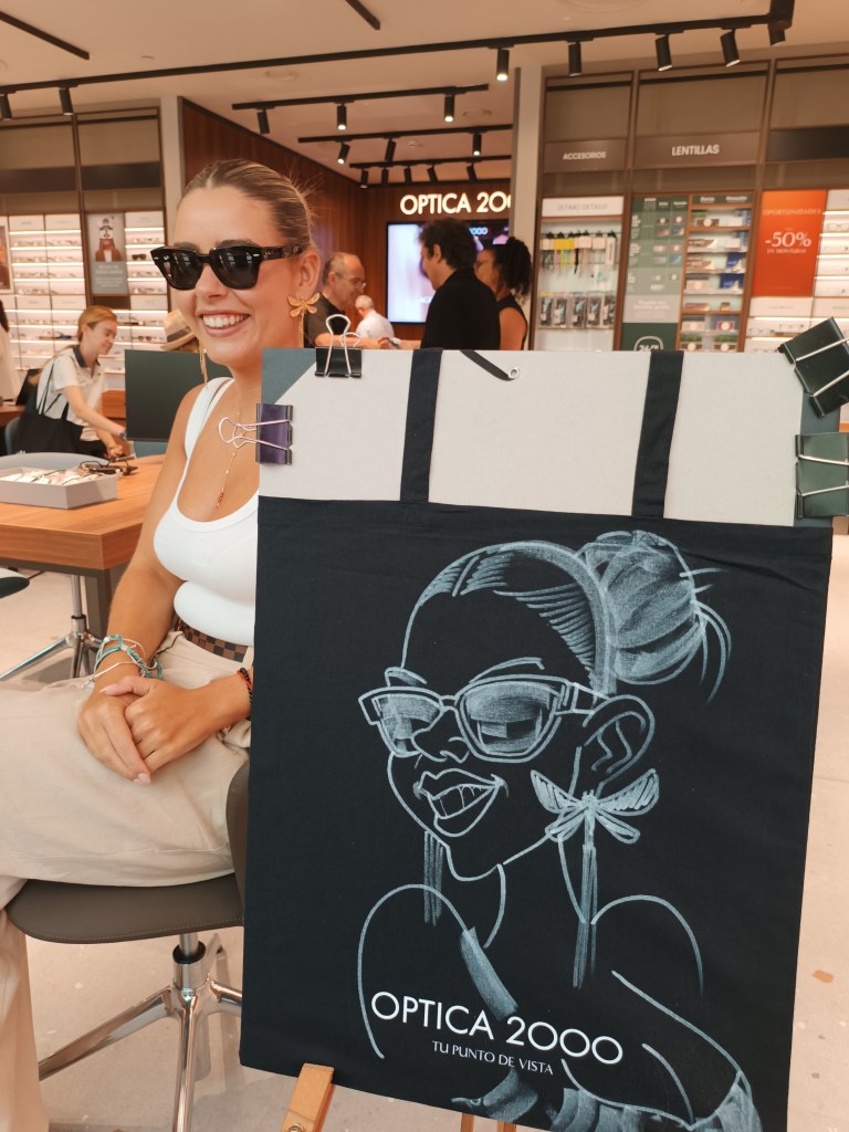 Los primeros clientes de la nueva tienda de OPTICA2000 pudieron disfrutar de un excelente coctel y se asombraron de los grandes regalos de bienvenida que la marca les brindó , como un par de gafas graduadas o una totebag personalizada con una divertida y original obra artística realizada en directo sobre ese soporte . Su caricatura , realizada en negativo sobre tela de color negro.
