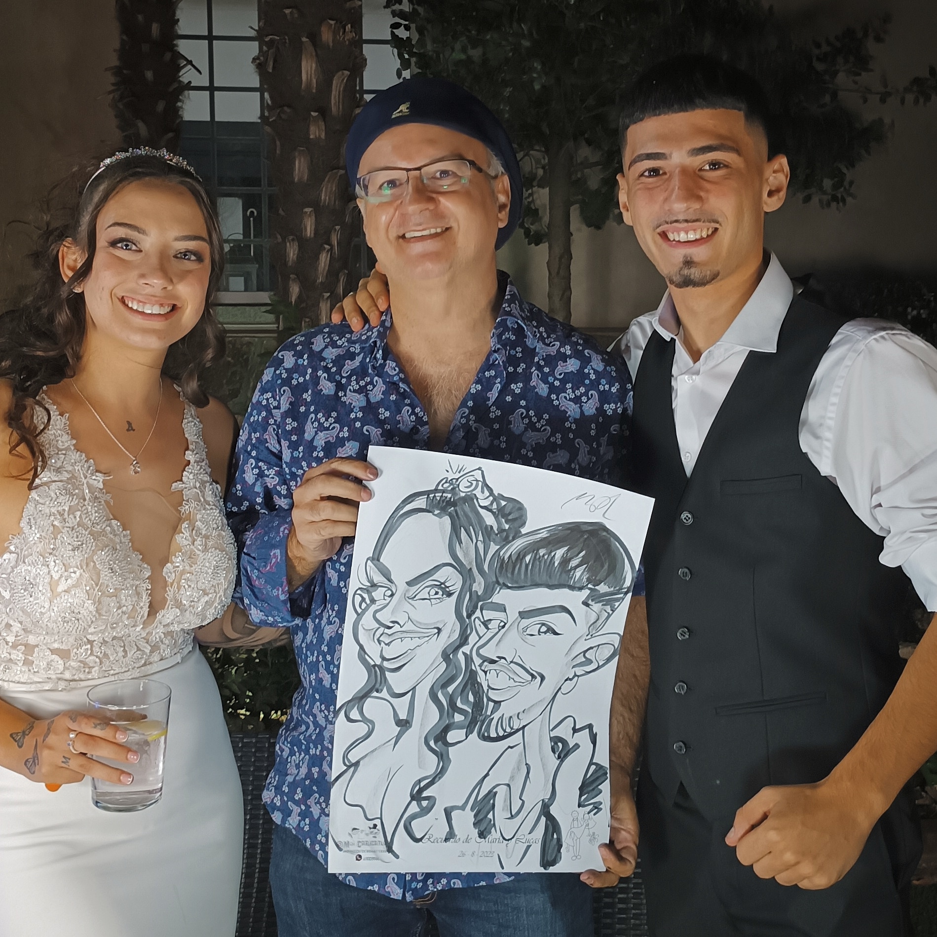 Ante todo aseguro un dibujo con calidad artística, que gustará a los invitados que los soliciten y les fascinará a todos los que se acerquen a ver como surgen en minutos las caras del papel en blanco . Será un gran recuerdo de vuestra boda .